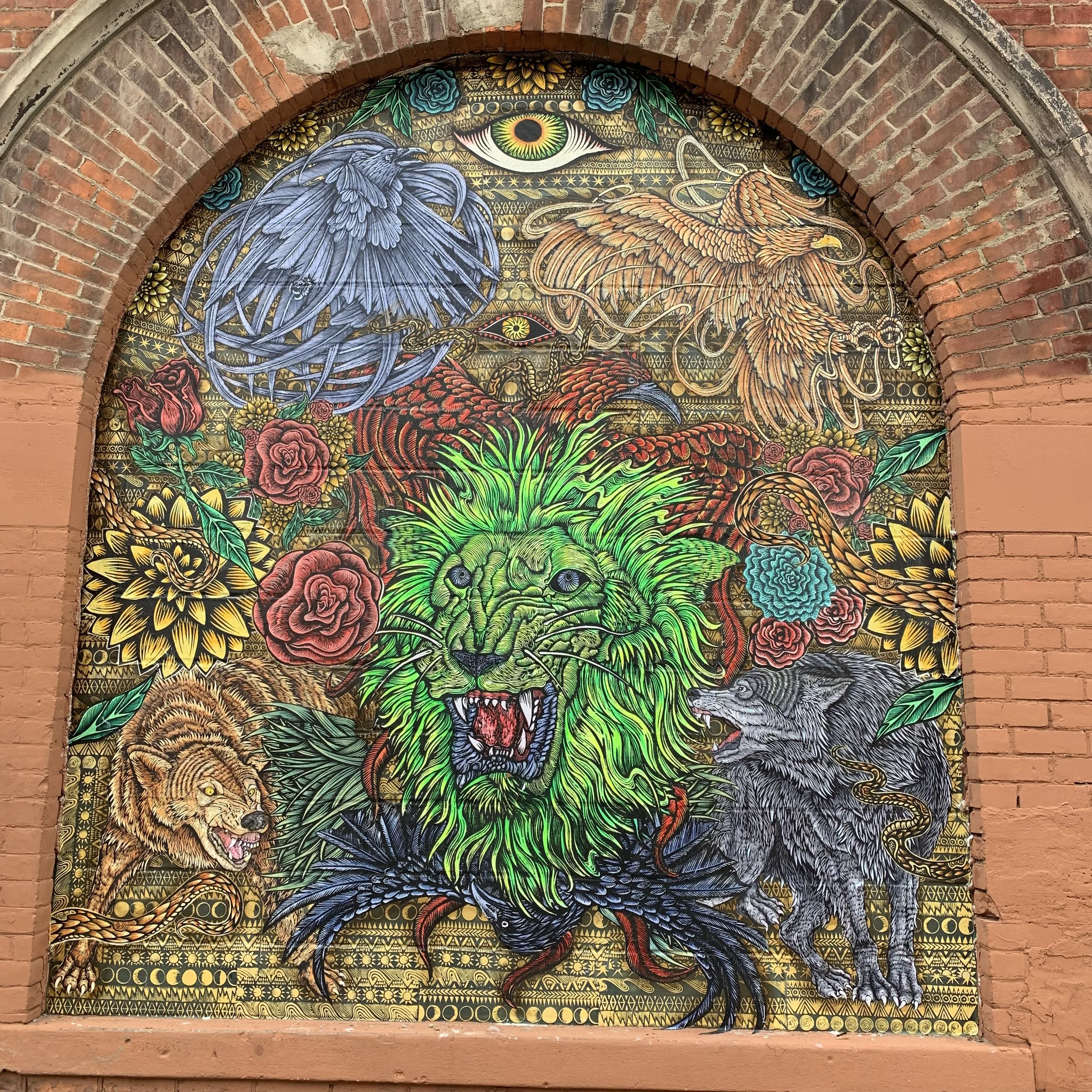Some other fun projects Wellington Court Mural Festival 2015, The small brick archway is for the Murals in the Market in Detroit hosted by 1XRUN 2019, The small banner sized paste up is in Copenhagen 2012.